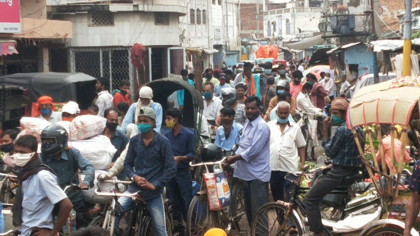 बाजार में ही नाका और बगल में थाना, फिर भी गुदरी बाजार में उड़ रही है सोशल डिस्टेंसिंग की धज्जियां।