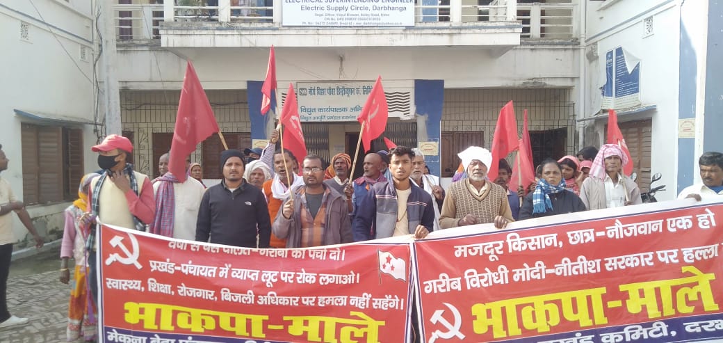 दरभंगा: गुरुवार को भाकपा (माले) बहादुरपुर प्रखंड कमेटी के बैनर तले विद्युत अधीक्षण अभियंता कार्यालय के समक्ष बिजली दर में बढ़ोतरी वापस लेने, दिल्ली-पंजाब की तरह बिहार के गरीबों को 100 यूनिट तक मुफ्त बिजली देने, बहादुरपुर प्रखंड के मेकना बेदा में फर्जी बिजली बिल को रद्द करने, बिजली बिल सुधार का पंचायत स्तरीय कैम्प लगाने आदि मांगों को लेकर प्रदर्शन किया गया।