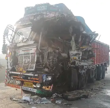एयरपोर्ट के मुख्य द्वारा के सामने दो ट्रकों के बीच भीषण टक्कर।
