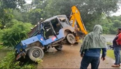 पुलिस जीप का ब्रेक हुआ फेल, अनियंत्रित होकर गड्ढे में पलटी।